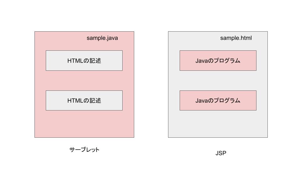 サーブレットは、Javaコードの中にhtmlが入っている。対してJSPは、htmlの中にJavaが入っている。